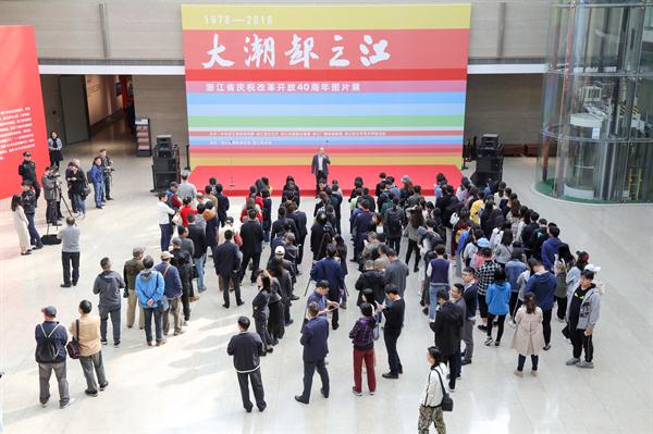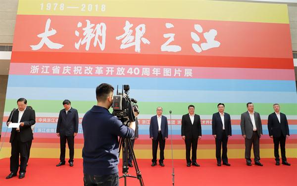 中共浙江省委常委、宣传部部长朱国贤宣布“大潮起之江——浙江省庆祝改革开放40周年”图片展开幕。本次图片展由中共浙江省委宣传部、浙江省文化厅、浙江日报报业集团、浙江广播电视集团、浙江省文学艺术界联合会主办,分“序篇”“忆·如歌岁月”“立·时代潮头”“享·美好生活”4个篇章,共展出680幅(组)1300余张作品,集中展示浙江改革开放40年来的光辉历程、伟大成就和宝贵经验,特别是“八八战略”实施15年来改革开放和社会主义现代化建设取得的历史性成就和历史性变革。