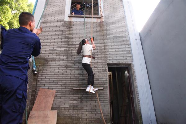 最激动人心的消防实践体验是楼层绳索攀爬,这是队员们日常救援必备的技能。在他们的示范下,同学们个个跃跃欲试,想挑战一下这项“冒险”的活动,感受消防队员们的不易。