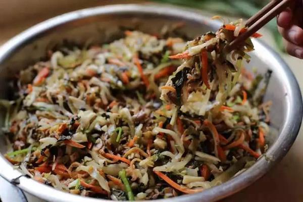 我是文化管理系18民族传统技艺班的张雯昕,来自丽水龙泉,龙泉“和菜”是龙泉人每家每户在春节前必备的一道菜。“和菜”意味着和气、和美、和睦、和顺,将腌萝卜、冬笋、海带、香菇、油炸豆腐、胡萝卜、黑木耳、芹菜、生姜、大蒜叶等十多种素菜切成细丝炒熟,五颜六色,让人垂涎三尺。