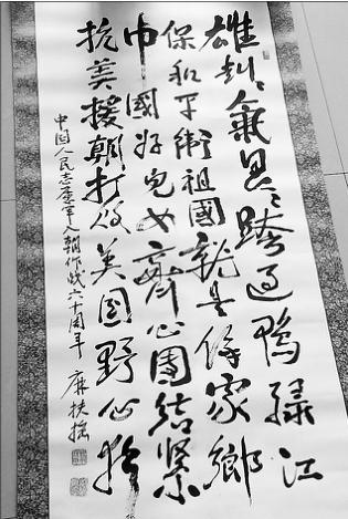 1950年10月,麻扶摇所在的部队奉命第一批入朝参战。入朝前夕,他在誓师大会上朗诵了一首出征诗,“雄赳赳,气昂昂,横过鸭绿江。保和平,卫祖国,就是保家乡。中国的好儿女,齐心团结紧,抗美援朝鲜,打败美帝野心狼!”这首诗主题鲜明,战斗性强,非常鼓舞士气,很快在志愿军中流传开来。