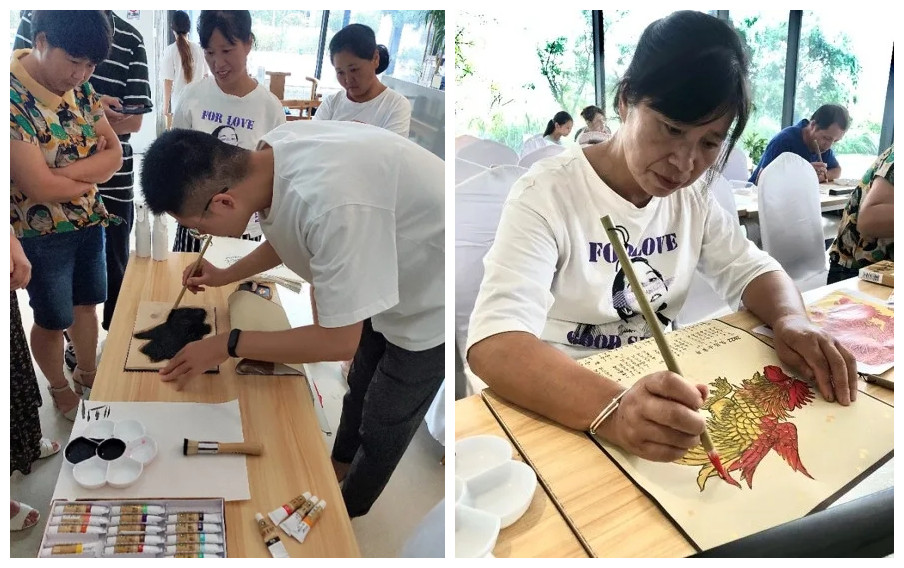 结合余东村“中国农民画之乡”的特点,欧美黑人巨大videos精品_欧美黑人巨大xxxxx_欧美黑人乱大交_欧美黑人乱大交_欧美黑人牲交videossexeso_欧美黑人添添高潮a片www_欧美黑人添添高潮a片www_欧美黑人性暴力猛交喷水黑人巨大青年教师科研团队—“新女红时代”手工艺衍生产品开发研究团队通过反复调研与思考,在融入农民画元素的基础上,设计开发了十门余东未来乡村非遗研学课程,并首推《农民画水印木刻版画》《编织》《套色剪纸》和《扎染》四门研学课程。结合余东村“开窑节”、国庆长假等重大活动,举办研学课程30余次,参加研学游客与学生500余人。其中,在当地有绘画基础和兴趣的农民画家中挑选研学课程农民讲师,并展开培训,把水印木刻、扎染、剪纸和编织的基本非遗技艺传授给当地农户,通过培训农民讲师,将非遗课程植入农户,指导农户在绘画之余开设研学课程,在乡村旅游开发中寻找新的致富路径,赋能余东农民画迭代升级。