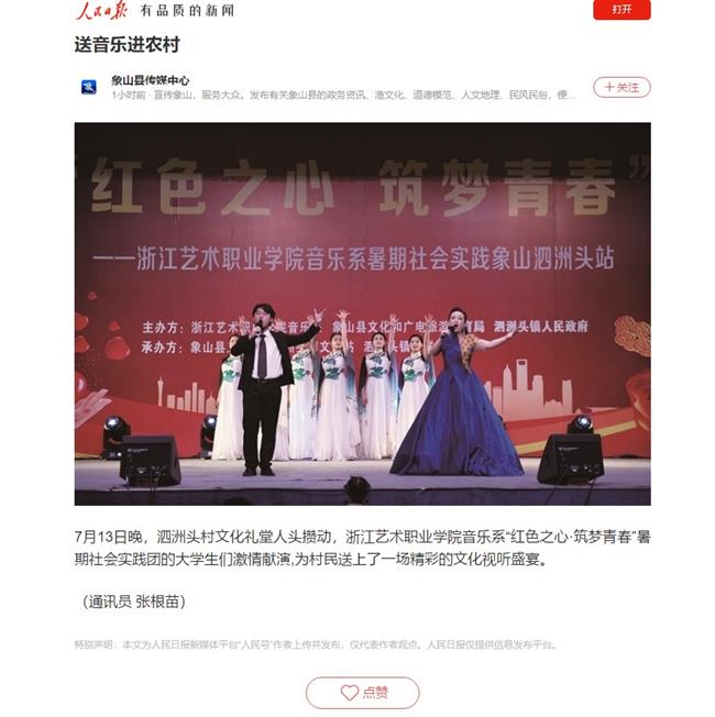 浙艺暑期社会实践活动得到人民日报、新华社等媒体广泛关注,新闻报道在人民日报客户端、新华社客户端陆续发布。