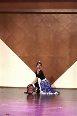 21歌舞班李佳倩演唱贵州民歌《摘菜调》、展示舞蹈《阿伽鼓》,既有活泼诙谐,短小精悍,说与唱相互穿插的民歌展示,还有别具一格的印地安舞蹈表演。