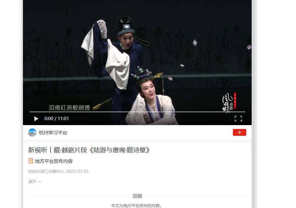 学习强国杭州平台:新视听丨藏·越剧片段《陆游与唐琬·题诗壁》