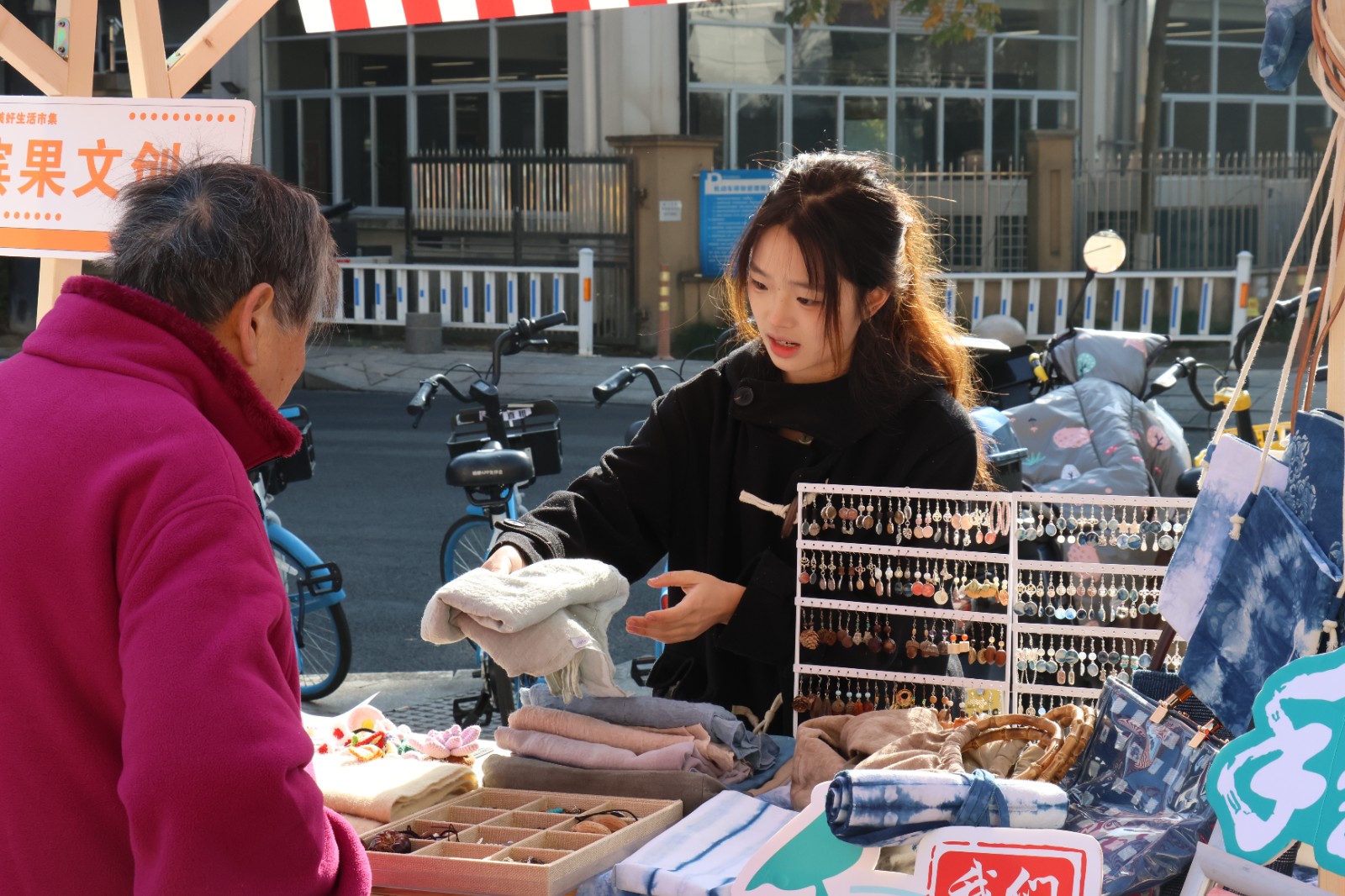 集市上,摊位热闹非凡,商品琳琅满目。手工艺学院民族传统技艺专业的师生团队紧扣课程体系,以独特的创意打造了别具特色的传统手工艺品,蓝染挂件、饰品、年历和植物染围巾被周边社区居民反复称赞。