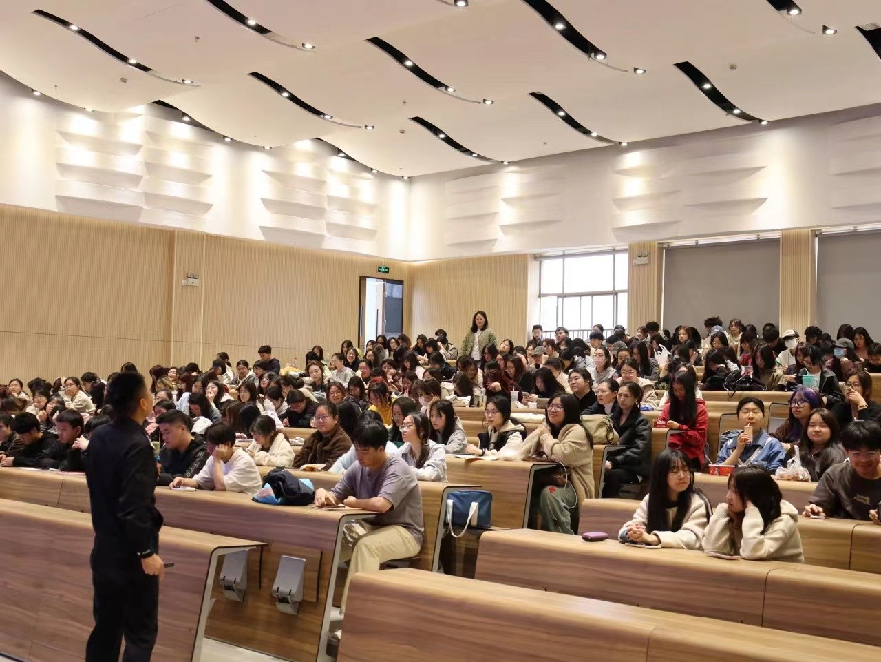 沈建松总结并分析了近年来“网络游戏虚假交易诈骗”“刷单返利诈骗”“冒充客服诈骗”“裸聊诈骗”“升级扣款诈骗”“微信聊天诈骗”等多种诈骗手段,以幽默通俗的语言让同学们认识到防诈反诈的重要性。讲述过程中,沈建松不时与同学们互动,现场气氛热烈,掌声不断。