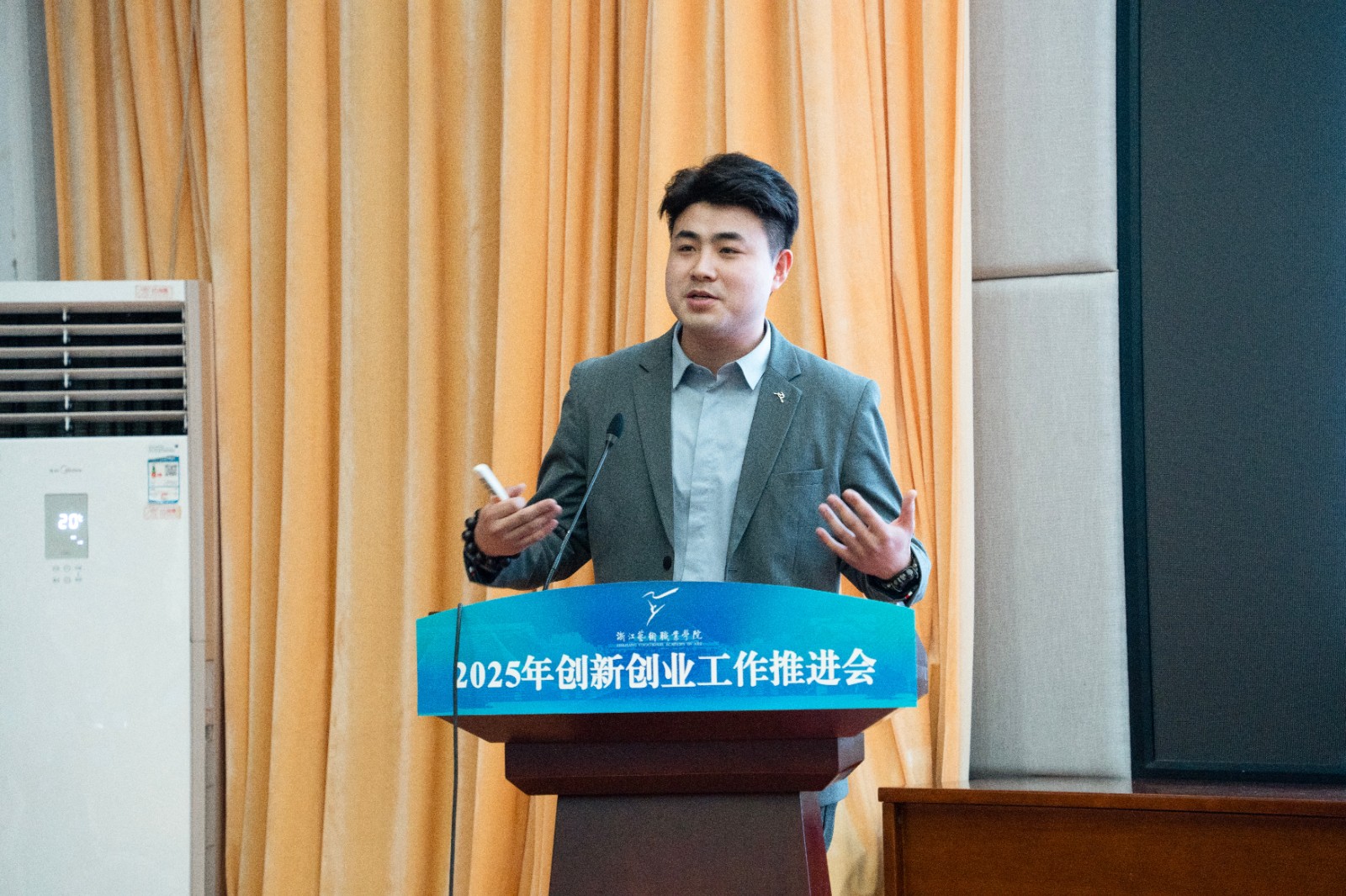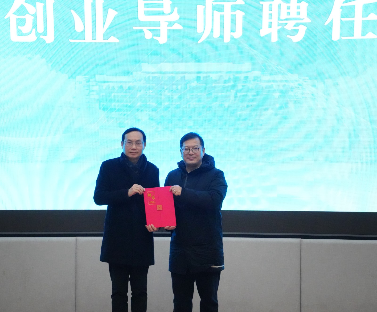 会议现场还举行了创新创业导师聘任仪式。施俊天为杭州大学生创业俱乐部主席、杭州市大学生创业联盟主席团主席郭羽颁发创新创业导师聘书。