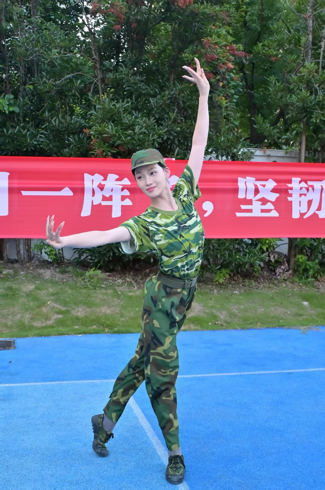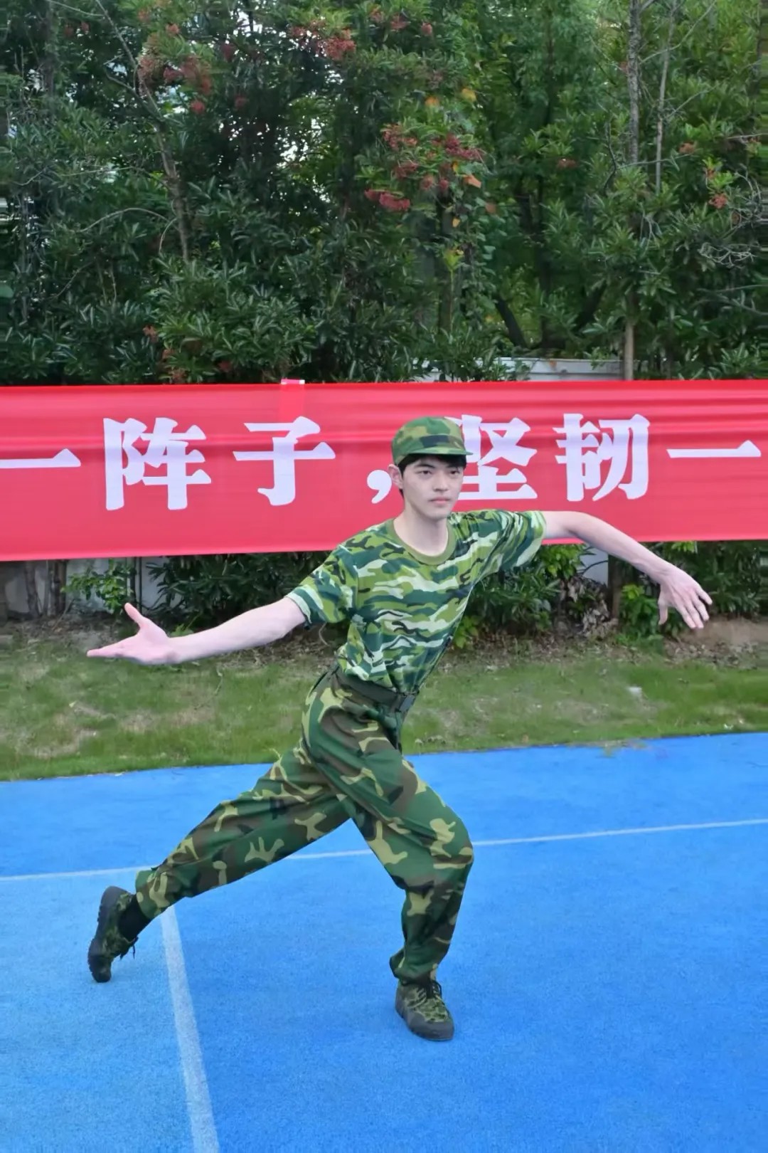 热浪里,汗珠顺着发梢砸向迷彩衣领。抬头看见横幅上的标语“骄阳淬炼钢铁意志,迷彩铸就青春担当。”深吸口气绷紧酸胀的腰背。转头望见邻排泛红的脸庞,交换的苦笑中,颤抖的手臂又添了几分力气。